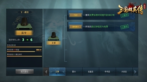一开始主公进入游戏并未获得任何爵位,需要通过不断晋升才能获得。空手套白狼显然在这里是无效的,因为360《三国群英传一统天下》里每一个爵位等级提升所需的条件都不同,有的需要获取足够荣誉值,有的则需要封地建筑等级达到条件,有的需要将领升级、升星、升阶……完成指定条件后,点击【提升爵位】按钮,即可轻松提升爵位!