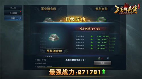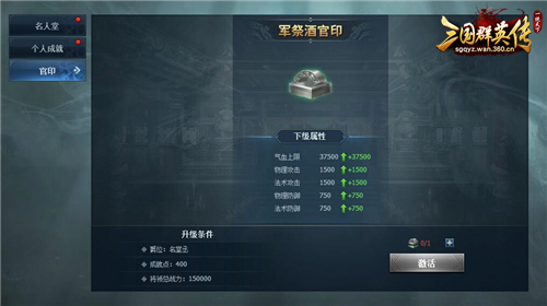 提升官印等级需要使用相应的激活材料,如:激活军祭酒官印的材料为都尉印记x1,此物品可在开服3天后拍卖物品中获得,获得特定数量并点亮升级按钮即可获得当前级别的官印,并获得气血上限、物理攻击、法术攻击、物理防御、法术防御在内的5大属性加成,使主公战力更上一层楼!