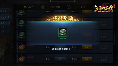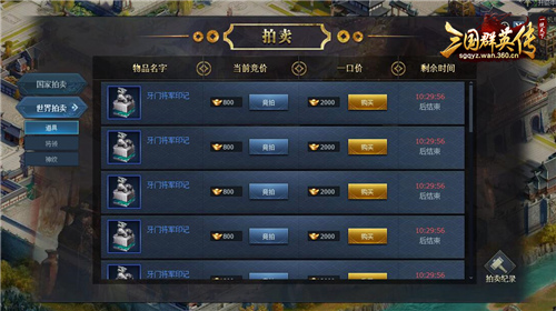 官印提升需要使用印记,在【拍卖】系统中,玩家可以使用元宝来购买各种印记。左侧记录了国家拍卖以及世界拍卖的物品,一般来说当前国家若是没有东西可以卖我们就会到世界窗口淘淘宝。世界拍卖又划分为道具、将领、神纹,而官印印记恰好在道具一项中,点击此项后玩家可以根据左侧名称找出自己需要使用的官印材料。价格分为“当前竞价”和“一口价”,当前竞价售价较低,可尝试购入,一口价的价格有时候是竞价的一倍之多,所以建议玩家尝试竞价后再购买。购买后所需印记后,就可以到官印系统中进行使用了。