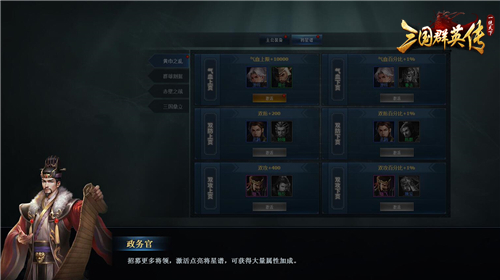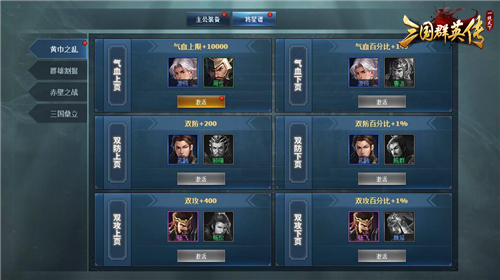 汇集名将是基础,能够用到刀刃上才是王道。在游戏内各位主公会获得各类品质的将领,这些将领彼此之间会有羁绊,也会有一些组合加成。将星谱将其分为气血、双防、双攻三大类型,气血不难理解,主要是负责主公的血量属性,双防则是增加防御属性,双攻则是不顾一切增加攻击属性。左侧上页对应具体数值,全部激活会增加相应数值的属性;右侧则是以百分比形式呈现,随着角色等级提升、武将实力提升而不断增强。