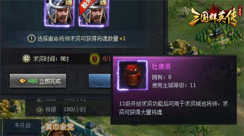 杜康酒可以通过活跃任务(当日活跃值达到150可领取杜康酒x2)和战功奖励获得。每天同个城池只能求贤1次,开始求贤后需要等待一定时间,期间被求贤的将领会发出求贤考验,通过考验可大幅度加速求贤进度。求贤结束后,可获得大量求贤将领对应的将魂碎片。选择与求贤将领有宿命关系的将领出访能获得更多的碎片奖励。