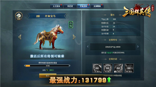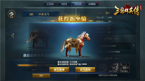 除了初始骑乘的白马无特性外,其他各品阶的坐骑都拥有独特的坐骑特性,如2阶汗血宝马,进阶至该品阶可激活本阶特性,所有将领气血+8000,主公的综合战力就会提升一大截。另外,坐骑还有4大独特技能,需要坐骑达到特定品阶才能解锁,战骑技能便可在战斗中尽情释放!