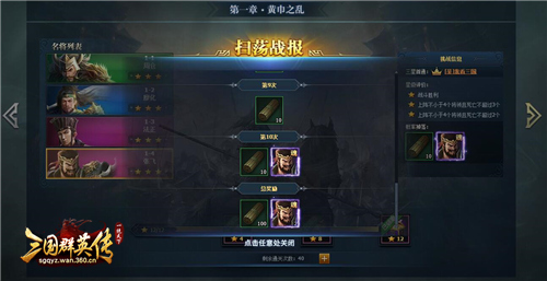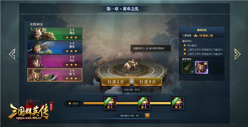 三星通过关卡后,即可快速扫荡该关卡,100%掉落兵书道具,概率掉落武将将魂。每天每个关卡有10次通关次数,每个主公每天拥有50次免费通关关卡的次数,每晚24点重置。倘若主公想要多获得挑战次数,还可以消耗少量元宝购买关卡挑战次数,随着重置次数增多,需要花费的元宝数也就越多,但是为了心仪的武将,值了!
