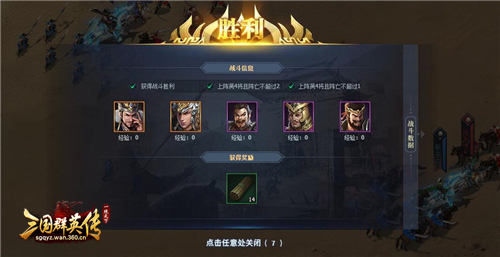 在名将挑战玩法中,主公们可以挑战关卡获取指定武将的将魂。每个章节有4个关卡,主公需要逐一顺序进行通关。每一章节升星条件都大不相同,战斗胜利可获得1星,另外根据要求上阵将领数量达到要求且死亡数量不超过指定数量,达成全部条件即可三星通关。达成三星首通提供的奖励还是很丰厚的,一定几率获得当前武将的将魂碎片以及初级兵书。当通关关卡积累本章星星数量达到指定数量,即可领取额外奖励!想要将它们全部收入囊中,就火速来挑战吧!