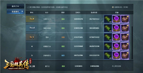 当主公所有武将都Game Over后就进入结算时间,给魔将造成伤害越高,主公获得的奖励也就越多,如粮草和坐骑进阶丹。同时,系统还会对主公们进行一次世纪大排行,打出高伤害排名也就越高,而且还会获得额外的自选卓越将魂奖励,简直就是武将升级的良物嘛!