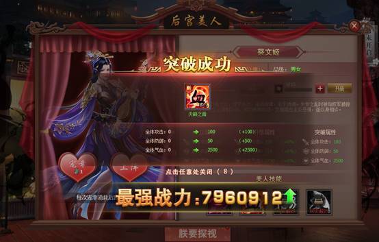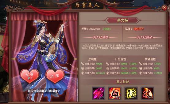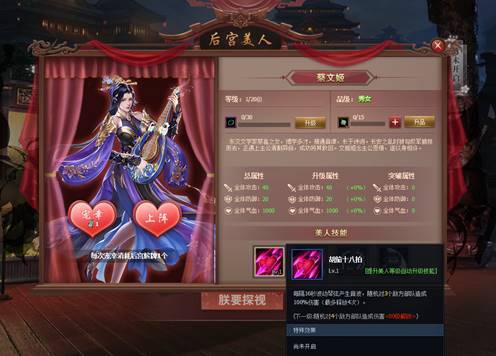 礼聘美人后,可派美人上阵,上阵后获得美人技能加成,未上阵时无法获得技能加成