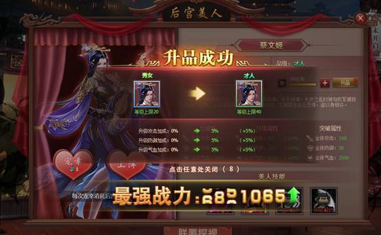 美人升到等级上限后,需要升品,才可继续提升美人等级,升品获得美人升级总属性百分比加成,最高加成50%