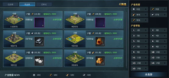 - 可占领产业分布列表图。可通过筛选急需的资源产业进行快速定位占领。