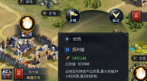 玩家可占领城市周边的村庄、农田、林场、矿场、牧场,每隔一段时间可收取各种资源。村庄产出银两;农田、牧场产出粮食;林场产出木材。产业级别越高,每小时产出的资源越多。