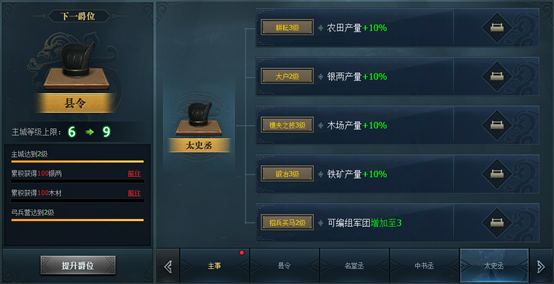 爵位升级:爵位需要完成获取功勋、完成皇榜任务数量、封地建筑等级、将领升级、将领升阶等指定任务来升级。达到指定条件,点击“提升爵位”轻松提升爵位。